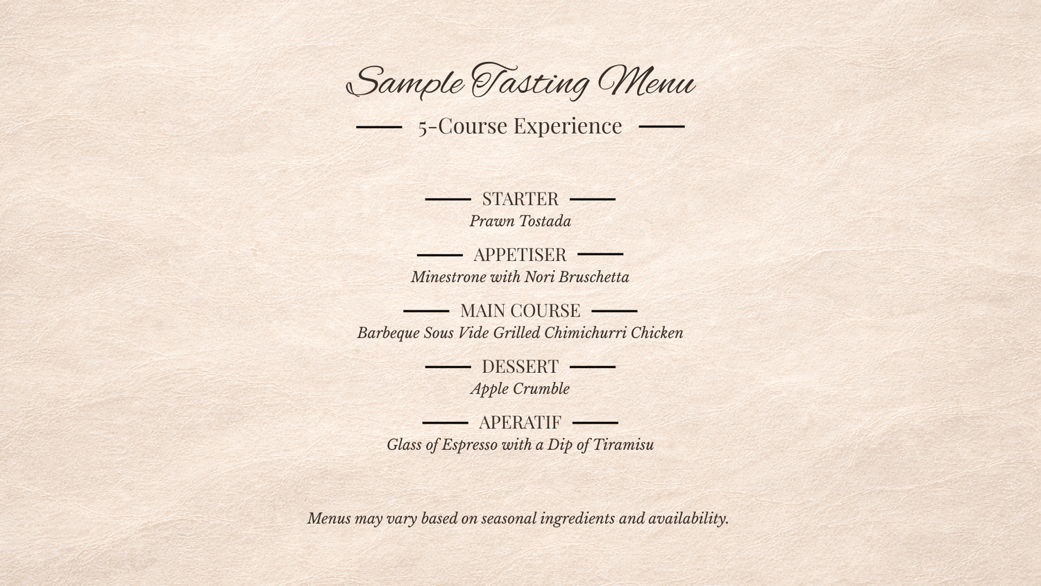 A carefully curated five-course dining experience that offers a complete and satisfying meal. Ideal for guests looking for a refined yet relaxed private dining experience.