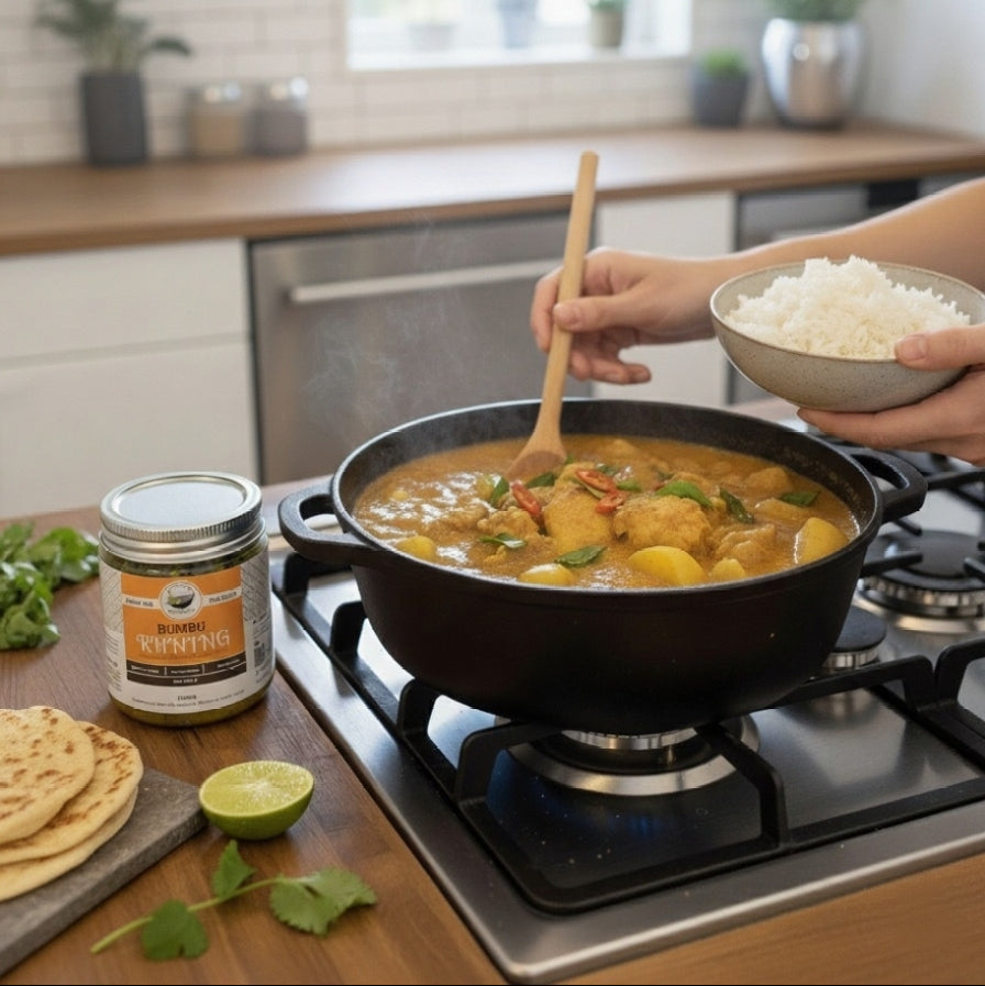 Bumbu Kuning is a fragrant golden-yellow spice paste made by blending aromatic herbs and spices, then sautéing them to release their full flavor. Its vibrant yellow color comes from turmeric, which gives the paste its warm, earthy depth and distinctive aroma.